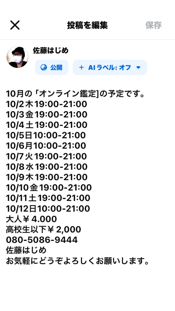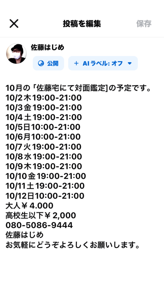2025年10月1日 / 最終更新日時 : 2025年10月1日 hazime.sato 占い 10月の予定です 受付時間[電話10:00-22:00] [メールフォームからのオンライン予約 24時間] 予約日時指定でのご予約※今日、明日お急ぎで鑑定を希望の際は必ずお電話にてご予約くださいませ 080‐5086‐9444料金¥4.000(50分間迄)高校生以下\2.000 御予約、お問い合わせ、飛び入り鑑定、相談随時お待ちしております。 それでは良い1日を。 #占い #占い師 #石岡市 #鉾田市 #鹿嶋市#神栖市 #水戸市 #手相 #つくば市 #土浦市 #タロットカード #気学